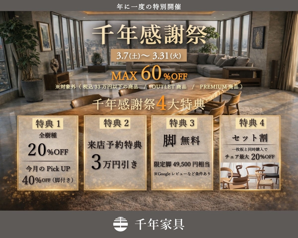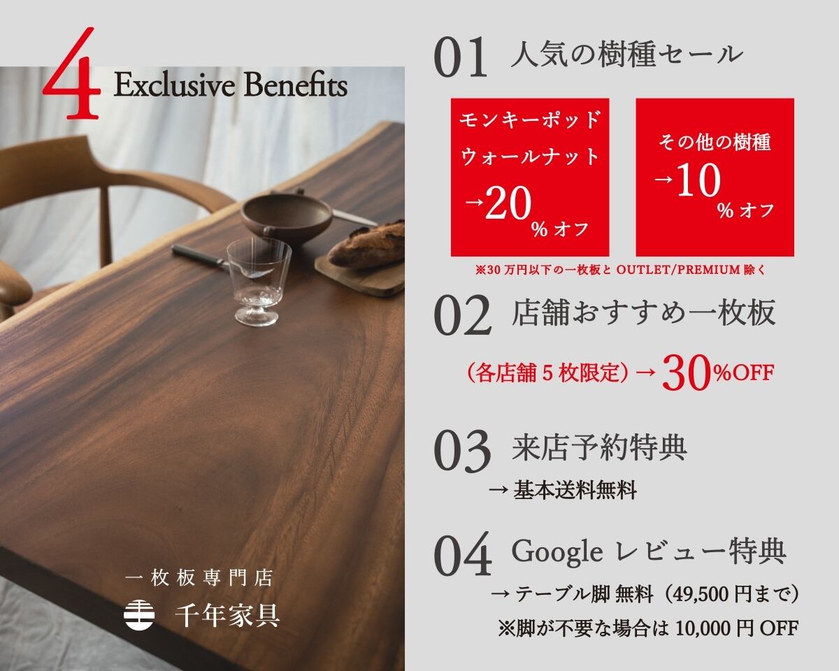 世界三大銘木の一つで黒みがかった木目が美しく、時を経るにつれてにじみ出てくる味わいが魅力です。美しい赤褐色のテーブルがワンランク上のお部屋に仕上げてくれます。