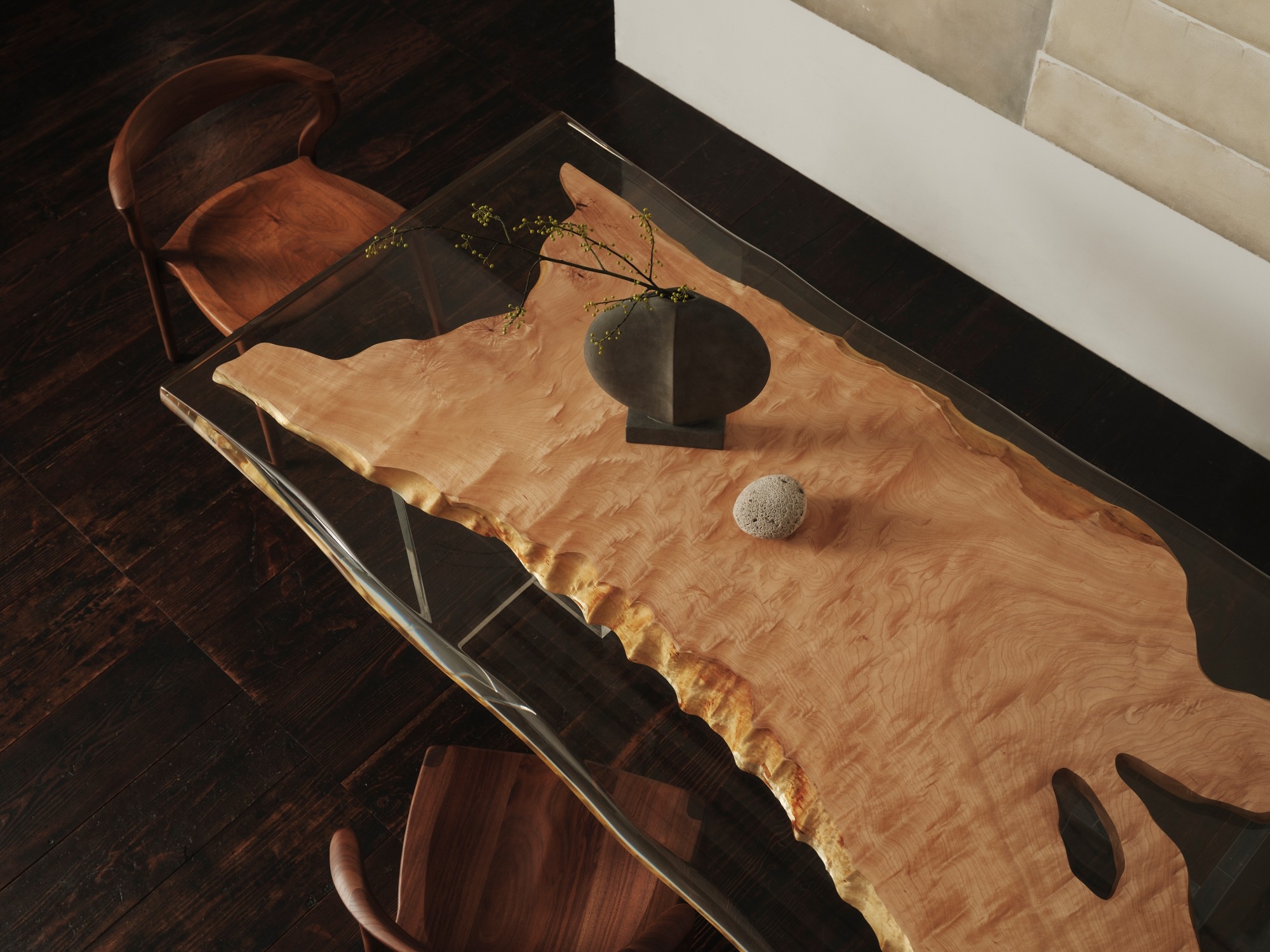 千年家具では、全国各地の製材所や伐採現場を直接訪ね、自らの目で杢の出方を確認した上で仕入れを行っています。杢の美しさはもちろん、その木が歩んできた年月や自然との関わりまでを大切にし、お客様に届けています。