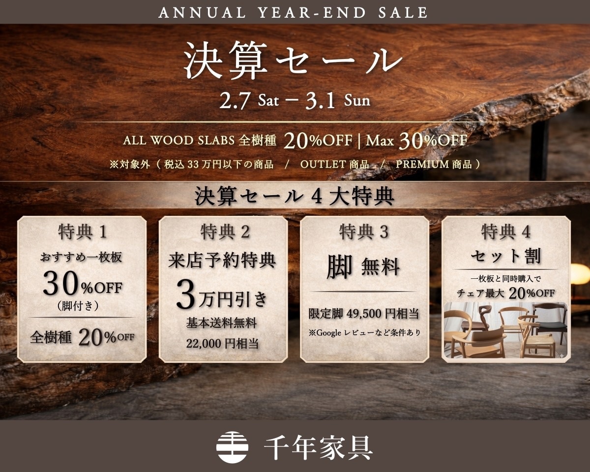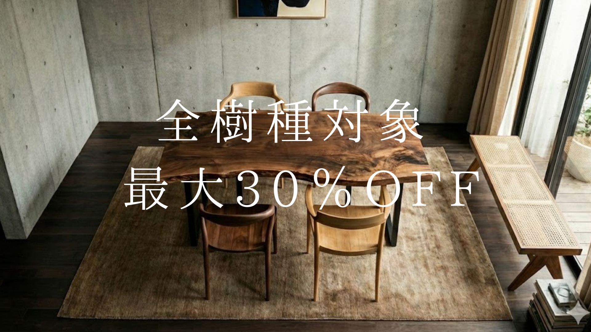 店舗おすすめ一枚板を30%OFF、全樹種を対象に20%OFFでご案内いたします。