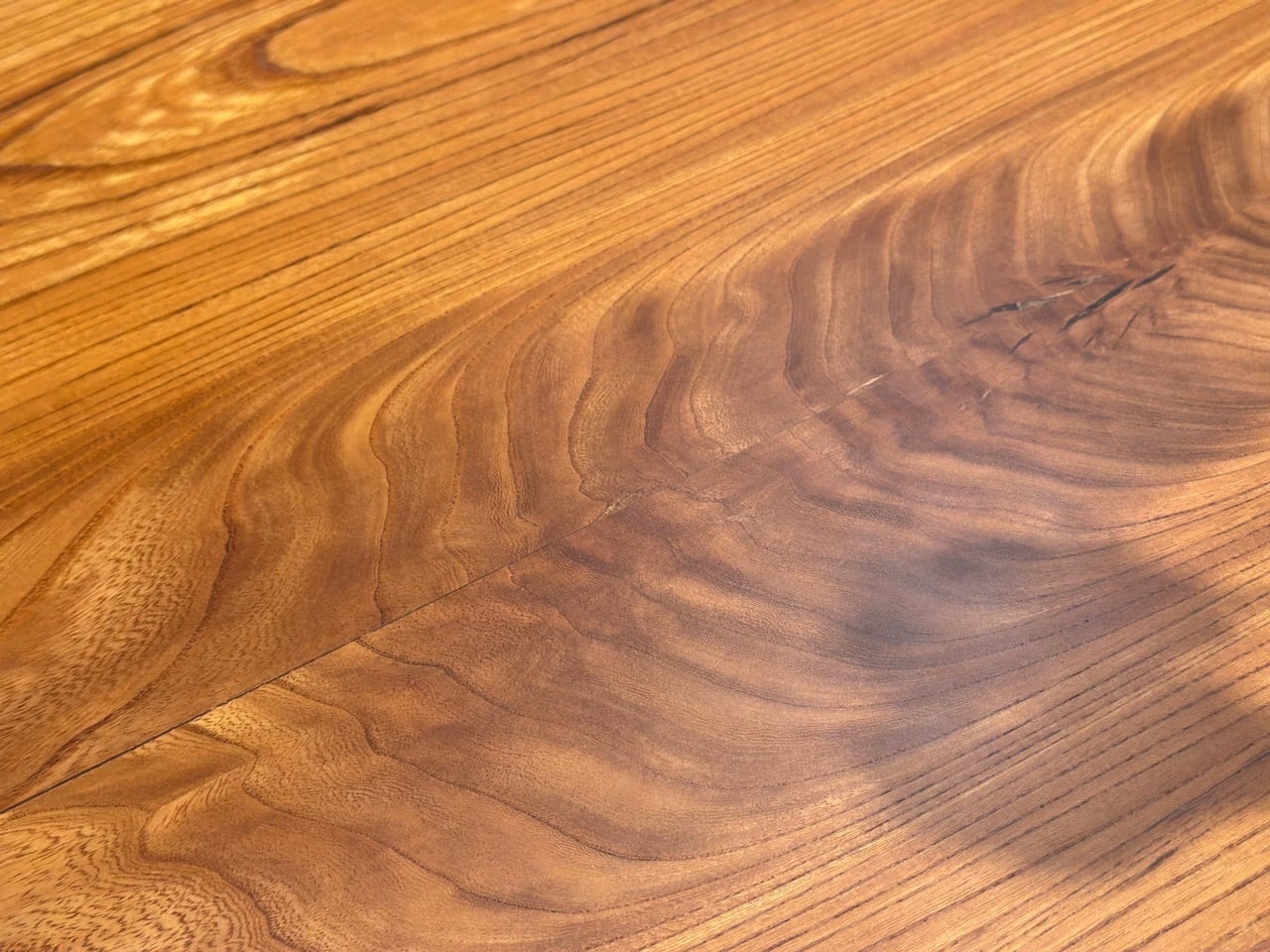 杢の滑らかな表情の出方や耳の緩やかな線が落ち着きを感じさせ、一枚板とはまた違うデザイン性の高い美しいシンメトリーの模様を楽しむことができます。