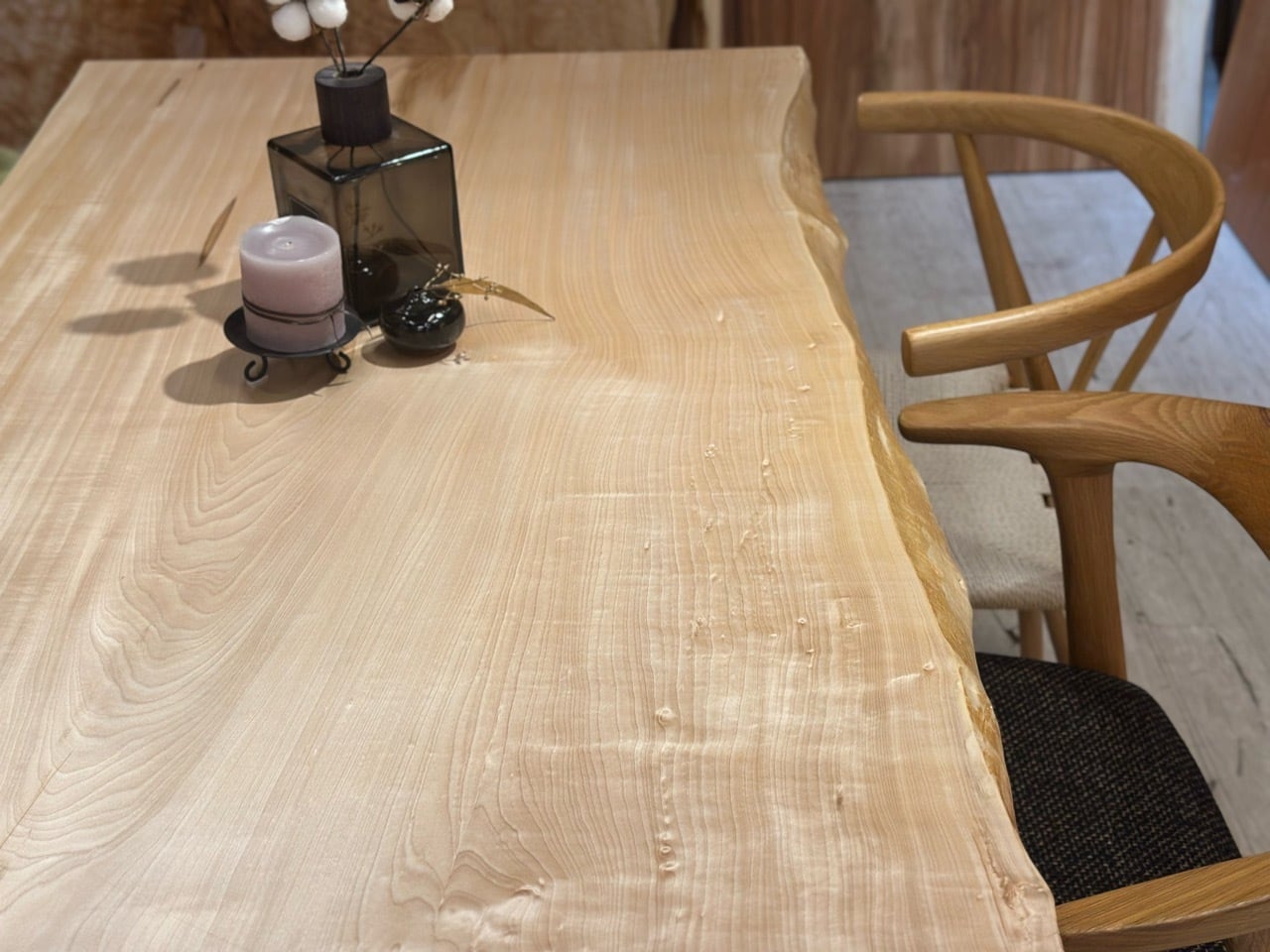 昼光の入射角の変化に伴い杢のトチは豊かに有機的な表情を見せてくれます。