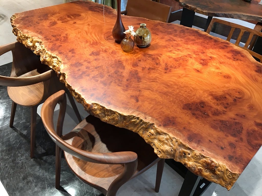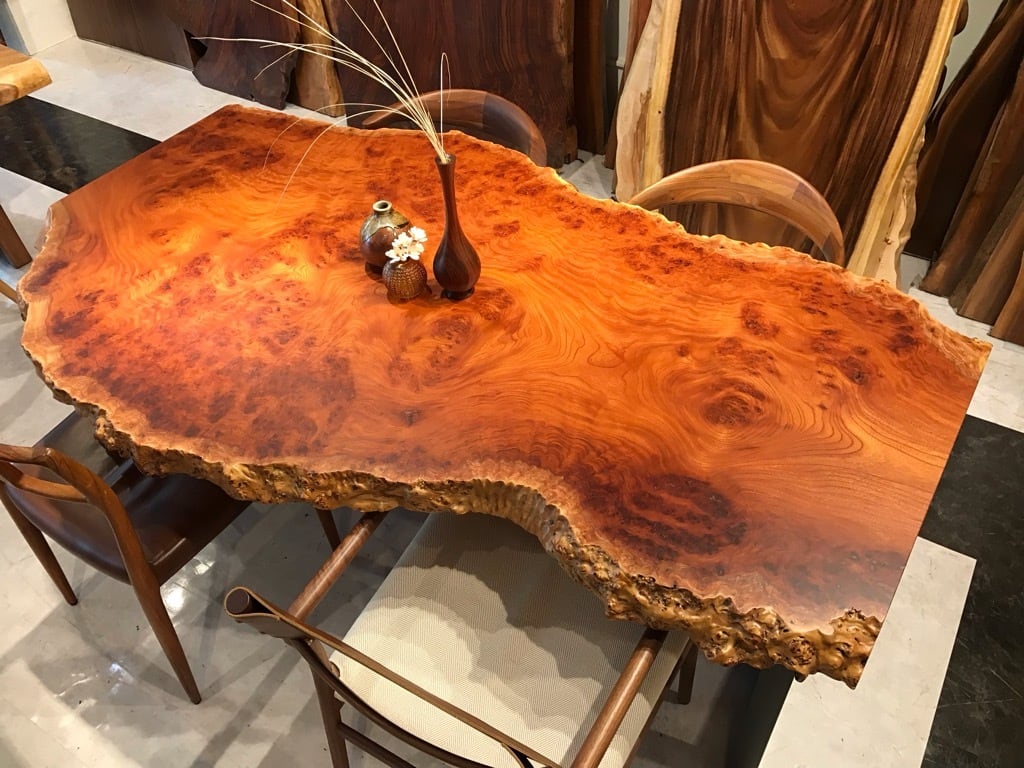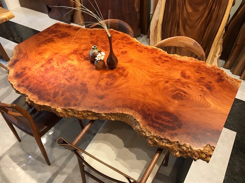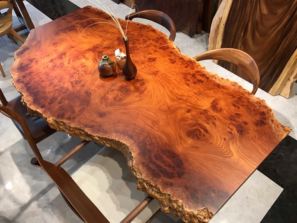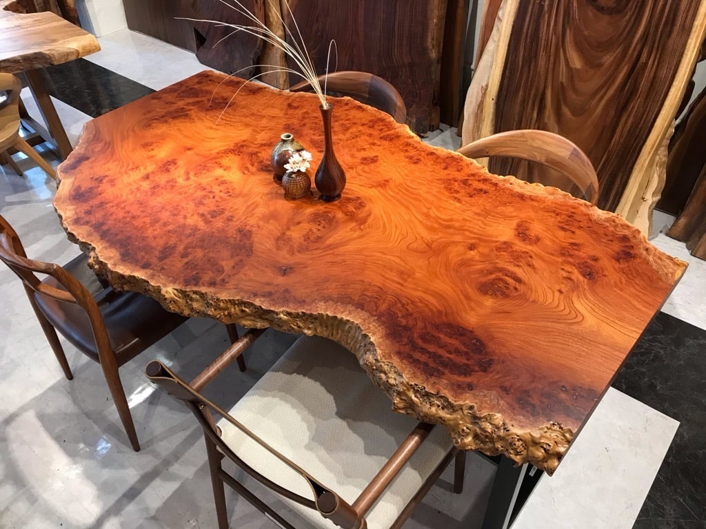 木目はとても美しく、特殊銘木とされる玉杢などの珍しい杢が出ることがあります。中でも「如輪杢(じょりんもく)」と呼ばれる、魚の鱗のように玉杢が重なる杢は、欅の最高峰と言われています。