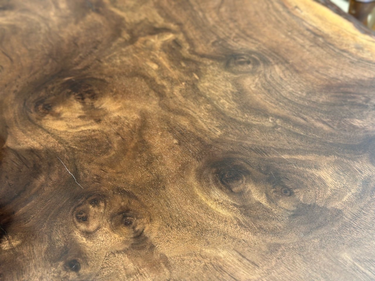 人工的に接ぎ木されて生まれたクラロウォールナットには、独特の細かい杢が生まれます。これは異種が配合されたことによる拒否反応が生み出した模様です。