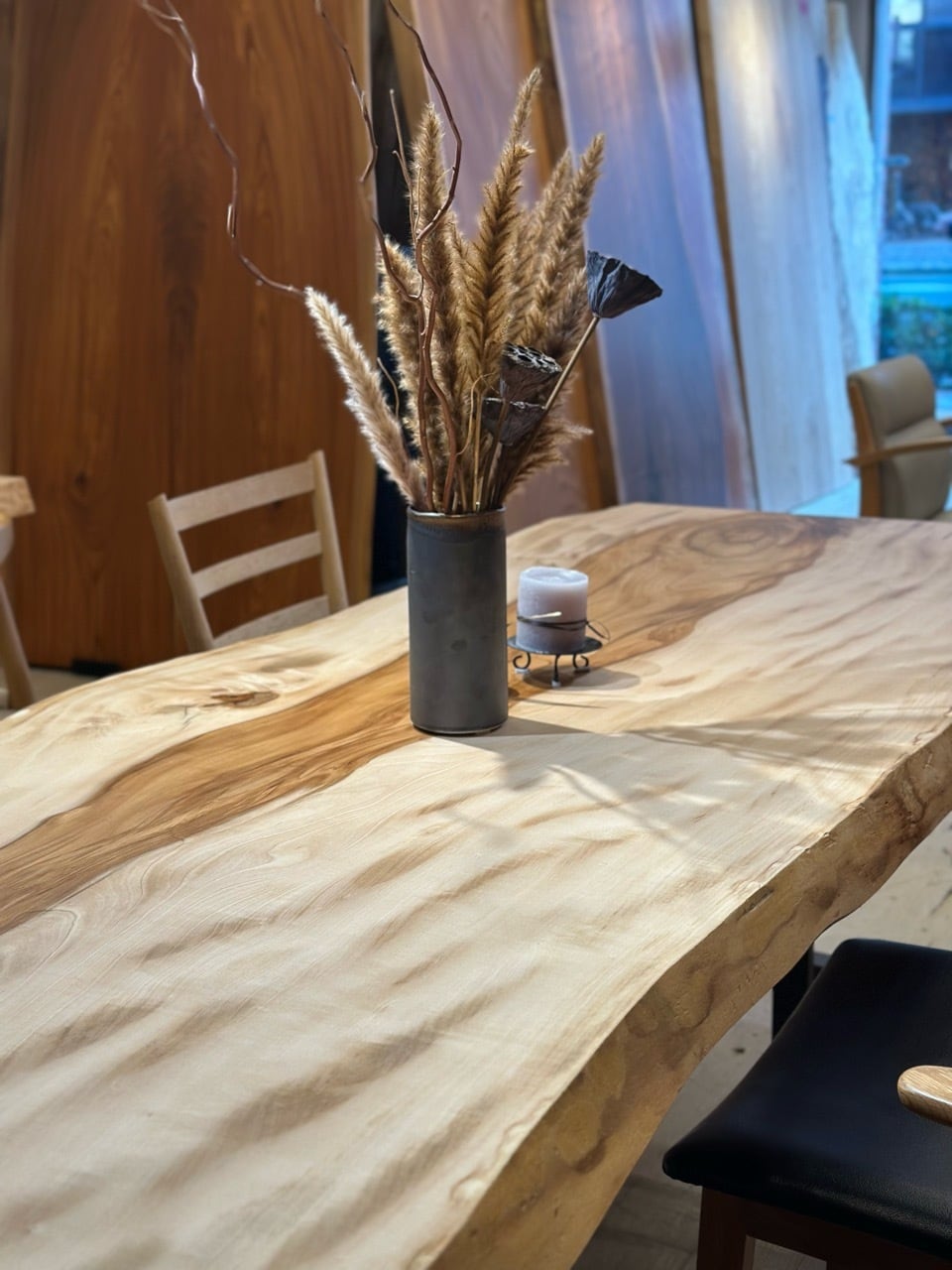 昼光の入射角の変化に伴い杢のトチは豊かに有機的な表情を見せてくれます。