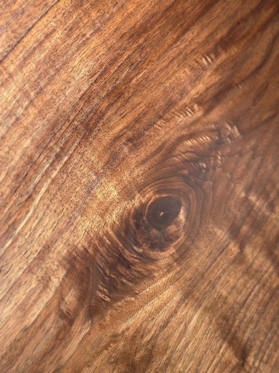 天然無垢の一枚板ウォールナットは、黒みがかった木目が美しく、時を経るにつれてにじみ出てくる味わいが魅力です。ウォールナットは伐採の際にはそれほど黒みがかっていません。味わいのあるウォールナットの褐色は、時を経て強まっていきます。この塗装無しでも美しい褐色は、木材や建材としてのウォールナットの人気を決定づけるものです。その上、つや出し剤もなじみやすいので扱いやすい木材です。