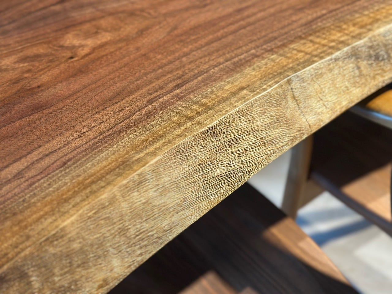 天然無垢の一枚板ウォールナットは、黒みがかった木目が美しく、時を経るにつれてにじみ出てくる味わいが魅力です。ウォールナットは伐採の際にはそれほど黒みがかっていません。味わいのあるウォールナットの褐色は、時を経て強まっていきます。この塗装無しでも美しい褐色は、木材や建材としてのウォールナットの人気を決定づけるものです。その上、つや出し剤もなじみやすいので扱いやすい木材です。
