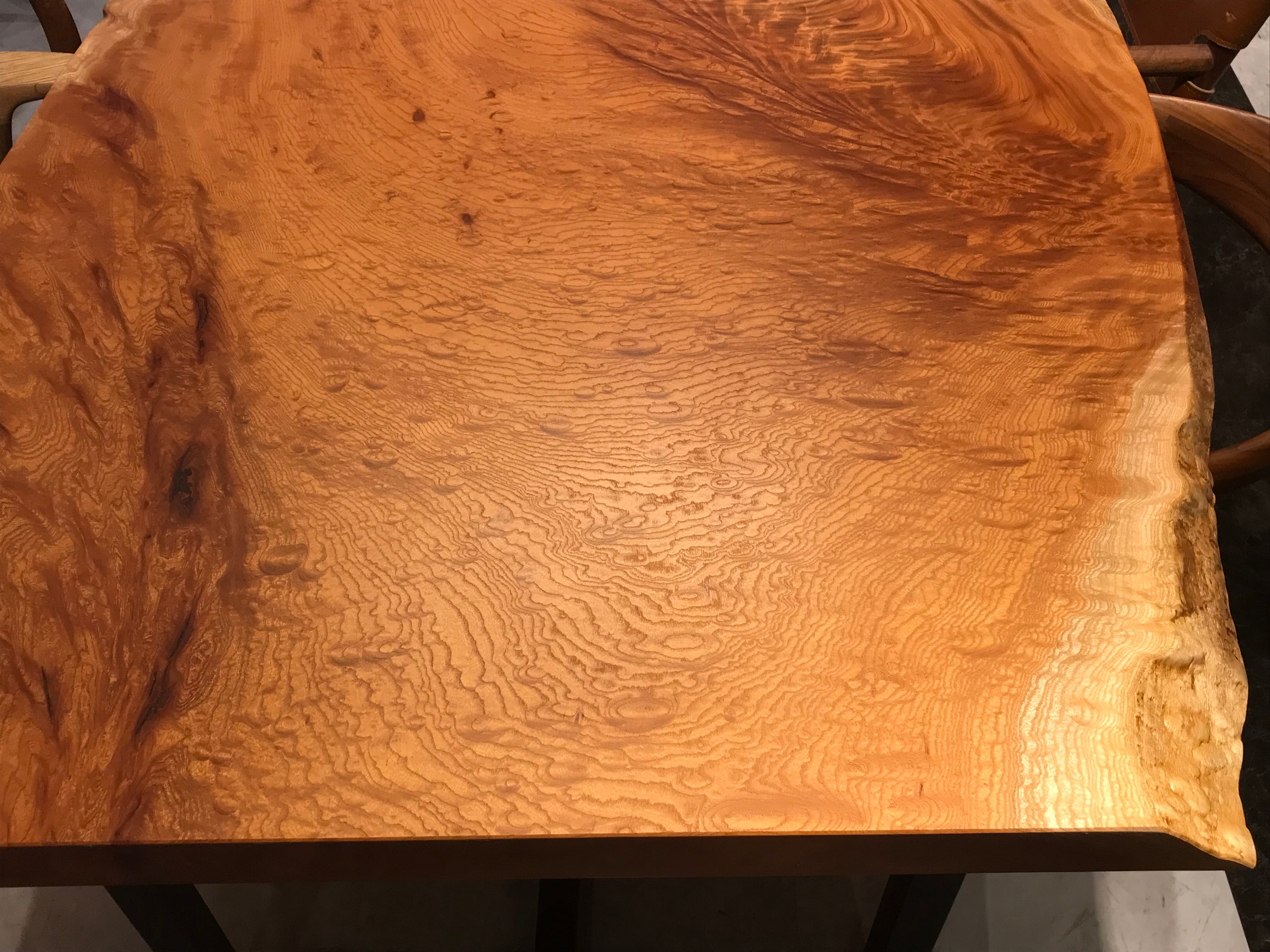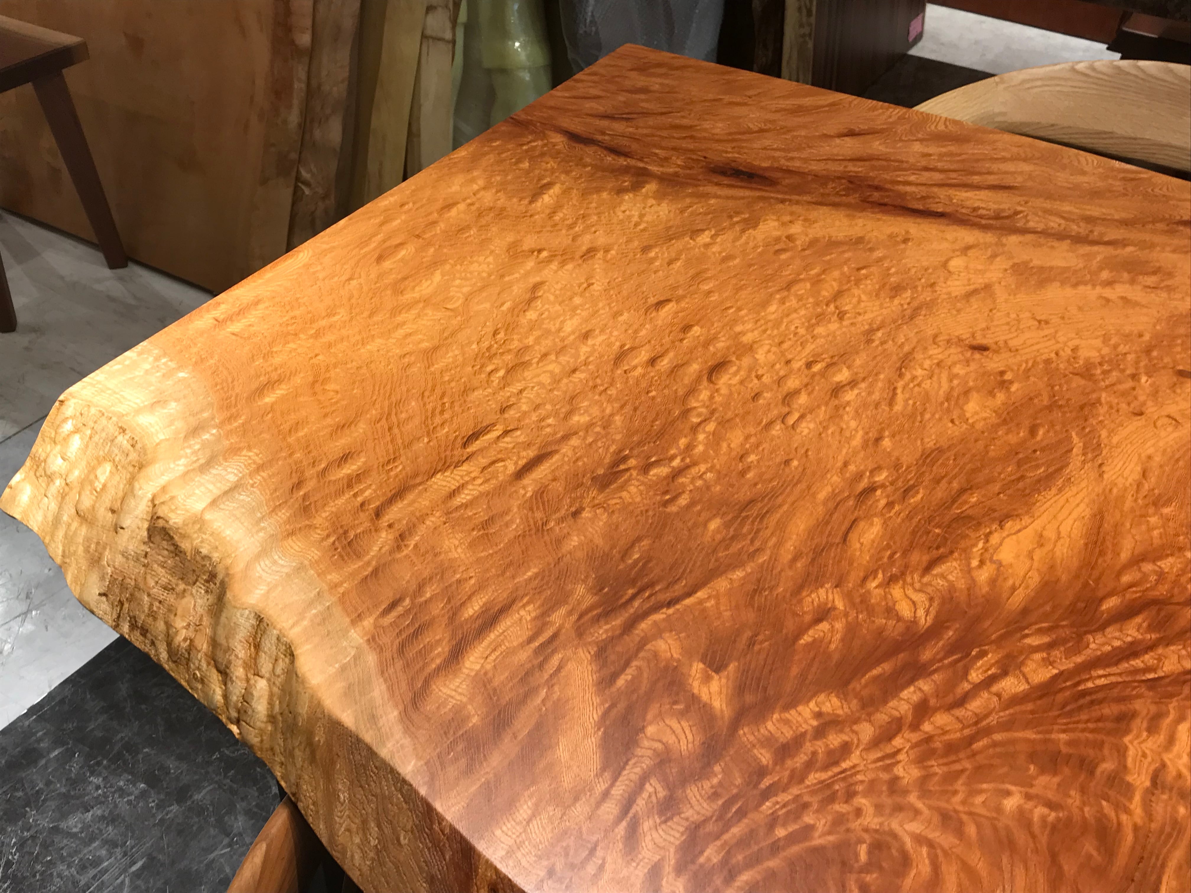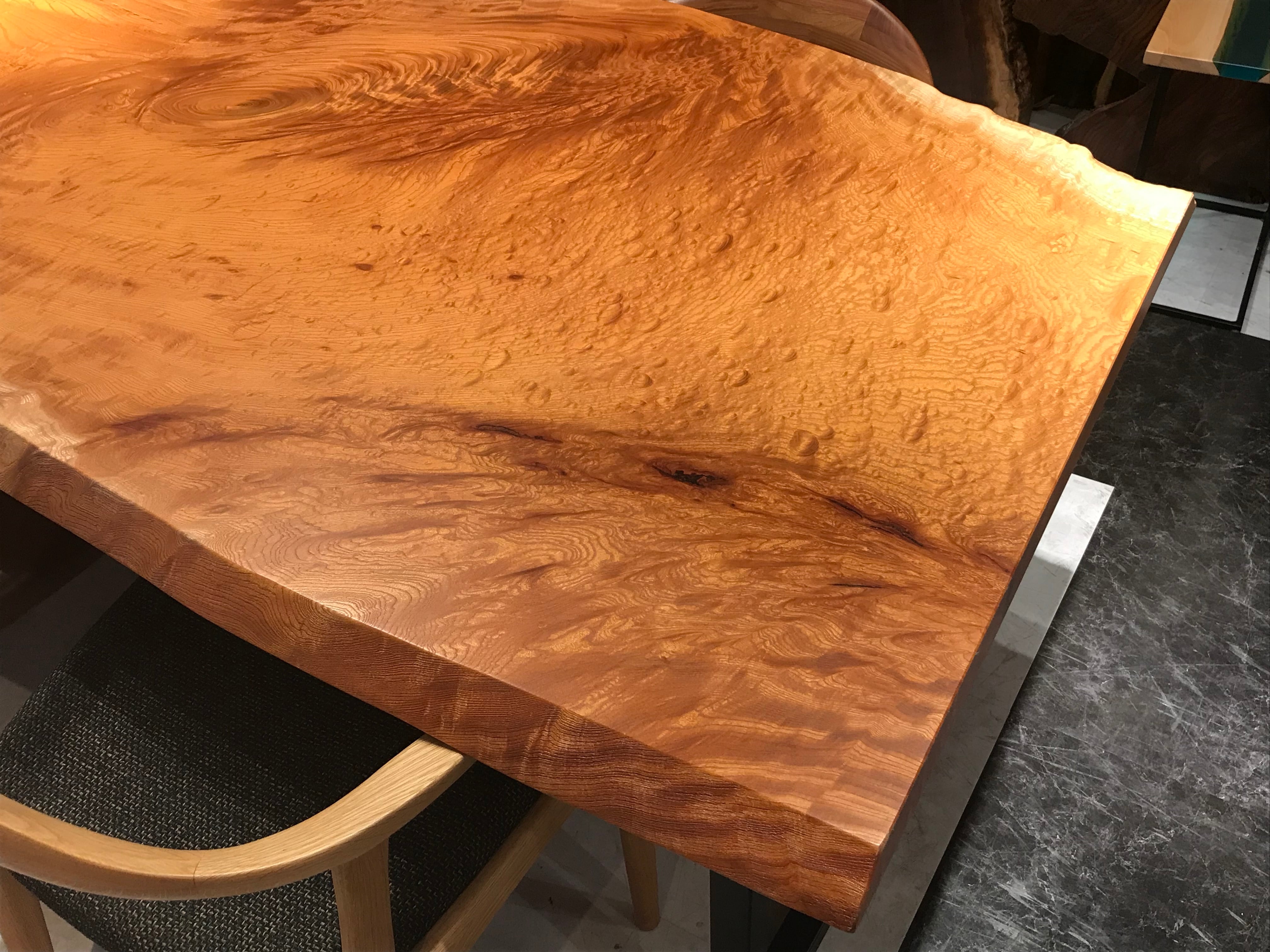 玉杢や如輪杢の欅一枚板は、ひじょうに希少性が高く、なかなかお目にかかれるものではありません。欅の古木、老木の中にのみ、ひじょうに低い確率で現れるという、スペシャルな中のスペシャルな杢です。
