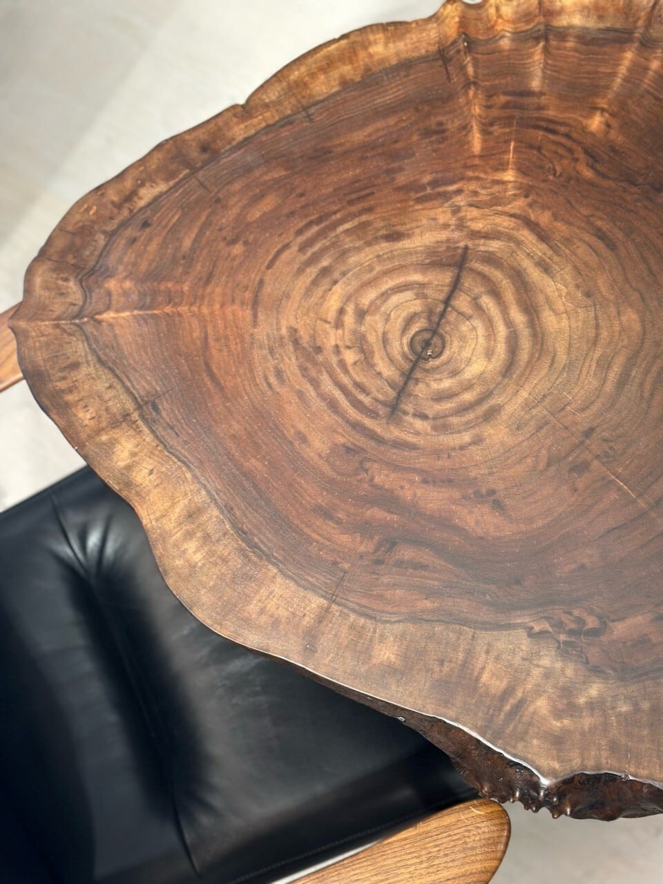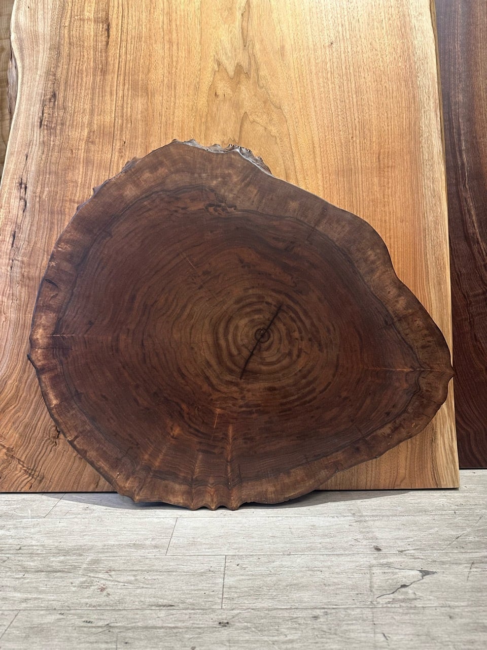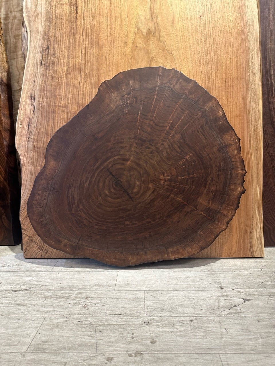 輪切りならではの年輪が中心から穏やかに広がり、大径木の力強さと落ち着きを感じさせる一枚です。