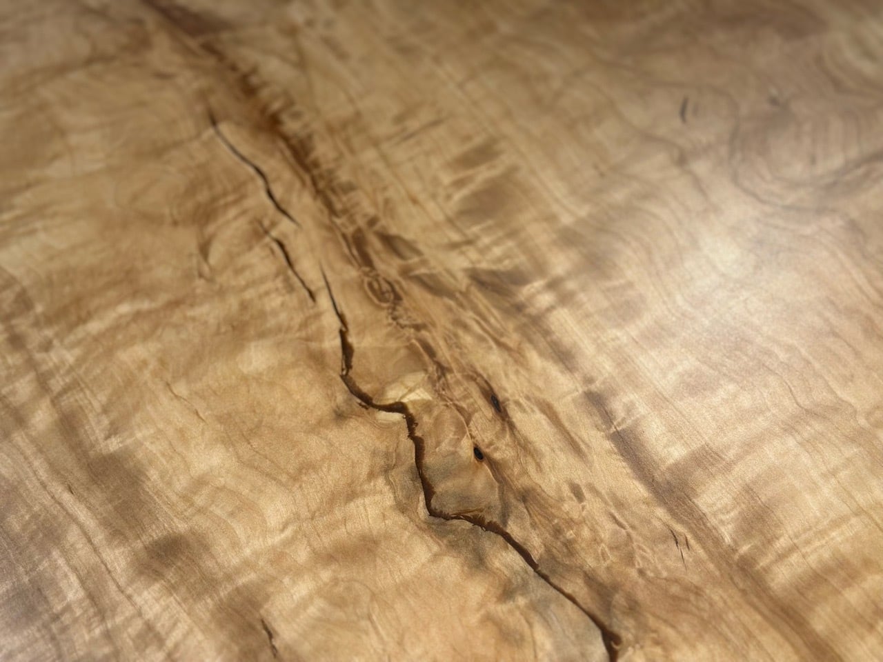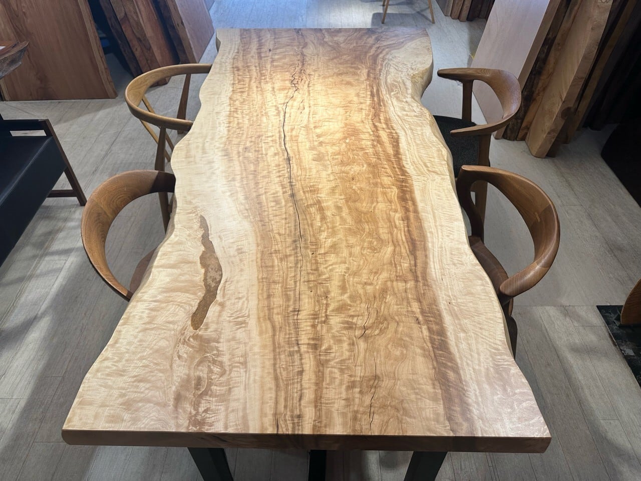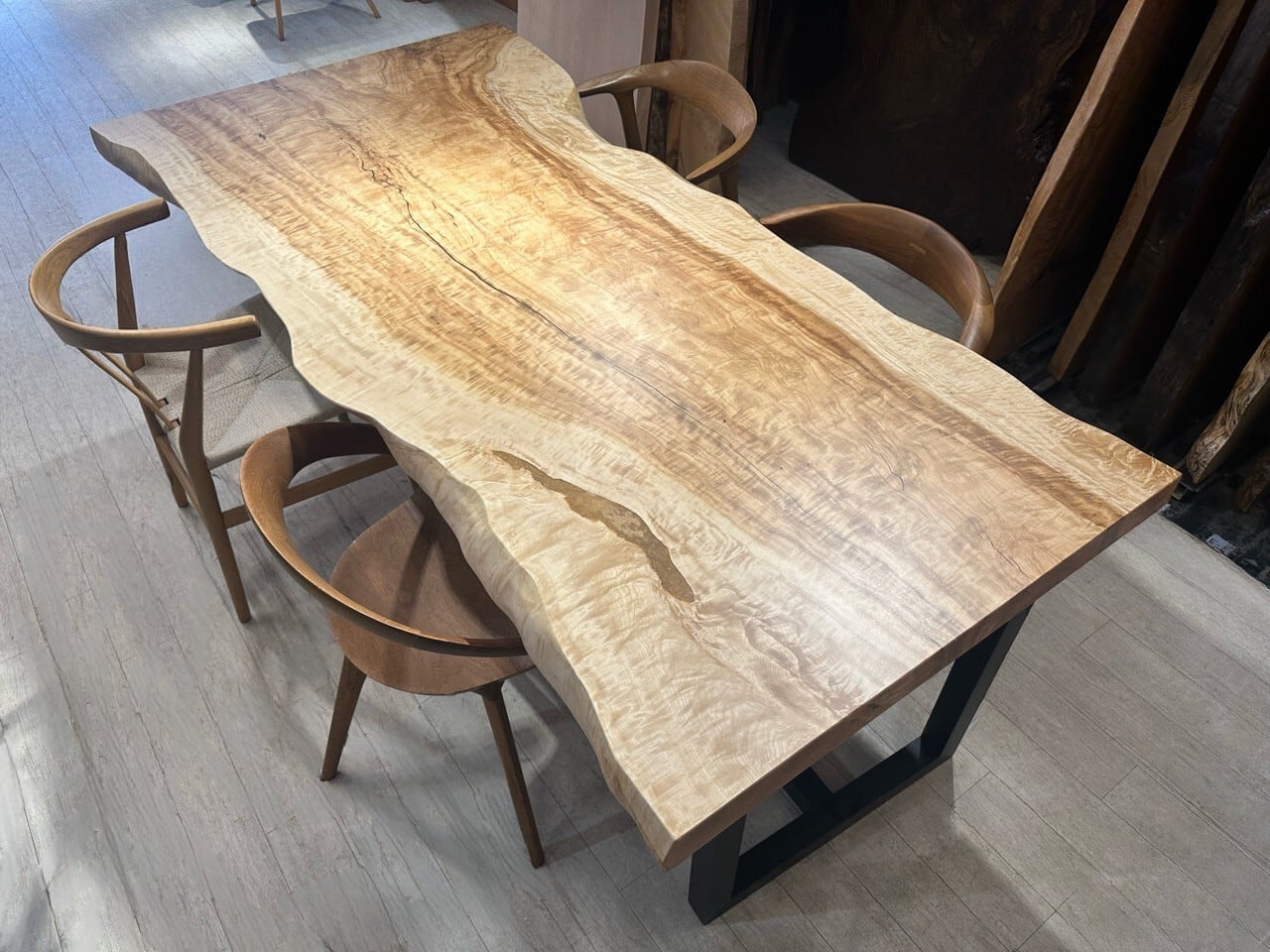 中央を走る濃淡のコントラストが全体に動きを与え、左右に広がる縮杢や波打つような杢が見る角度によって様々な表情を見せます。