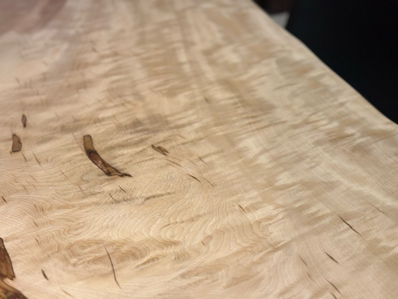 中央を走る濃淡のコントラストが全体に動きを与え、左右に広がる縮杢や波打つような杢が見る角度によって様々な表情を見せます。