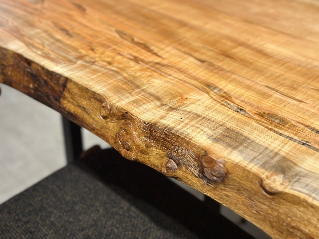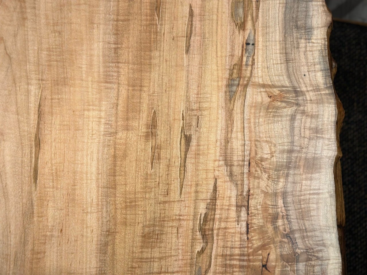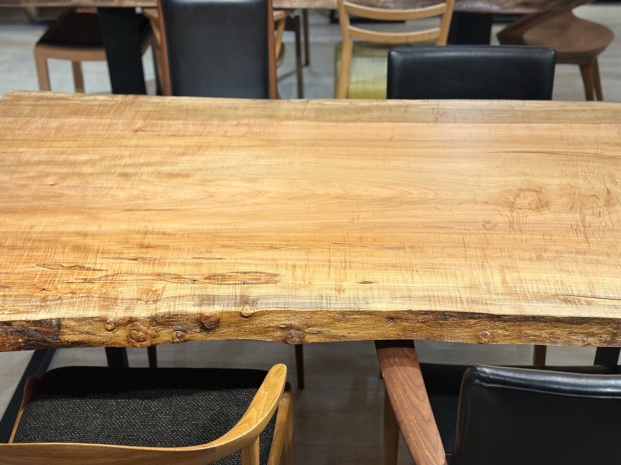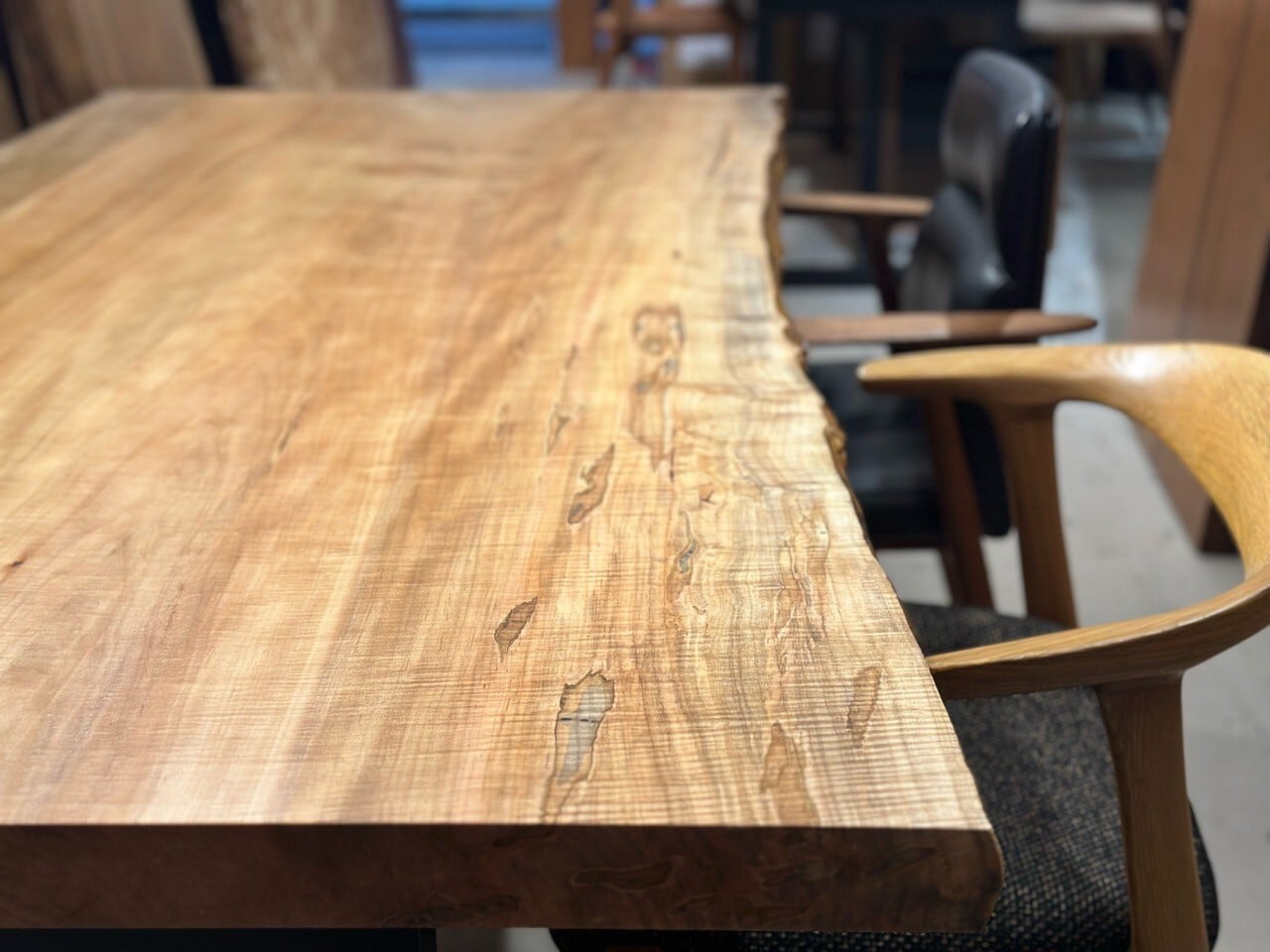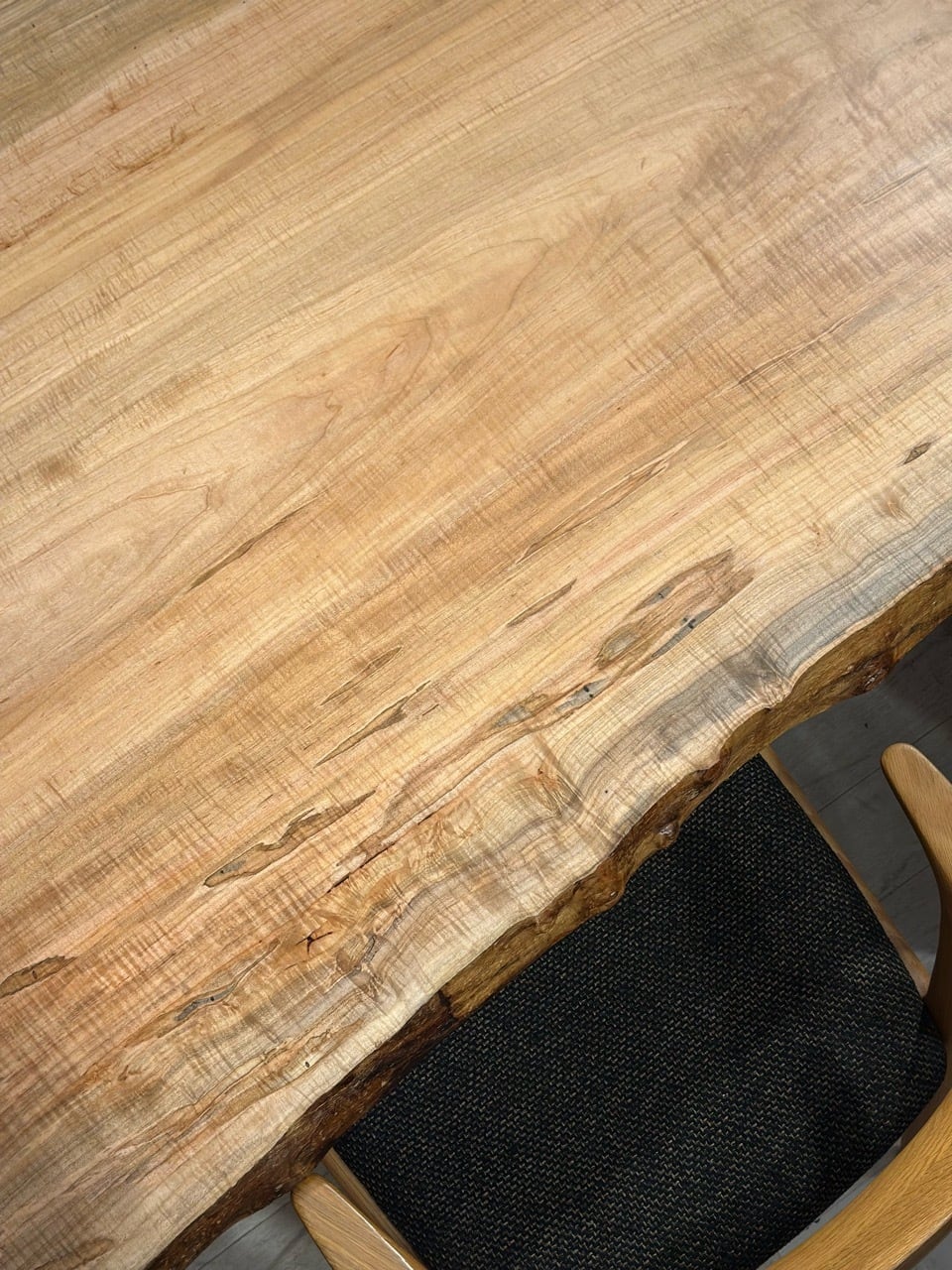 淡く優しい色合いの中に、緩やかな揺らぎを感じさせるカーリーメープルの一枚板。