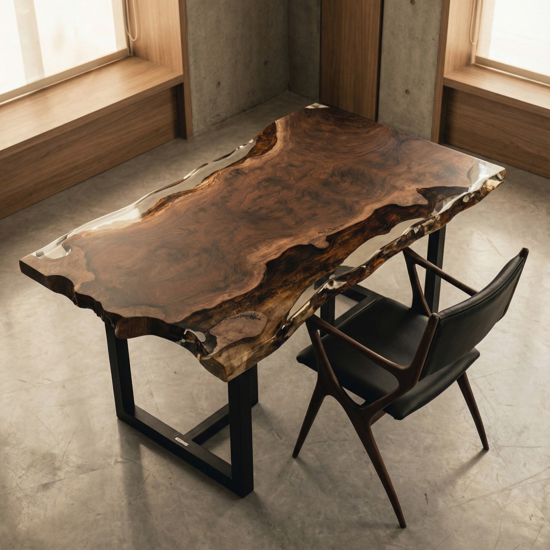 耳の美しさがレジンと融合されていることによって魅力を残したままテーブルとしてご利用いただけます。クラロウォールナットがレジンに全て埋まっている訳ではなく、一部は木のままなので触れることができます。