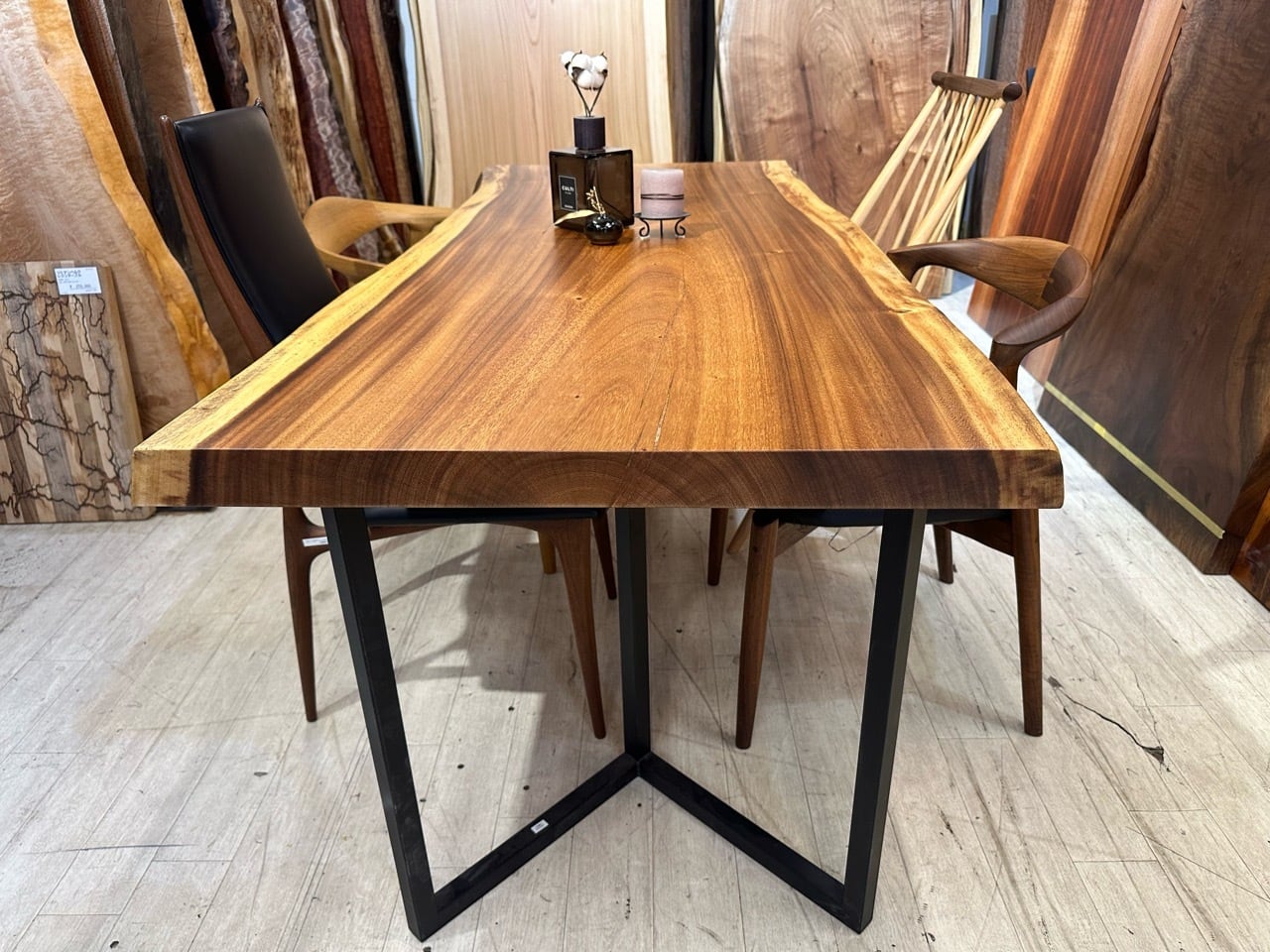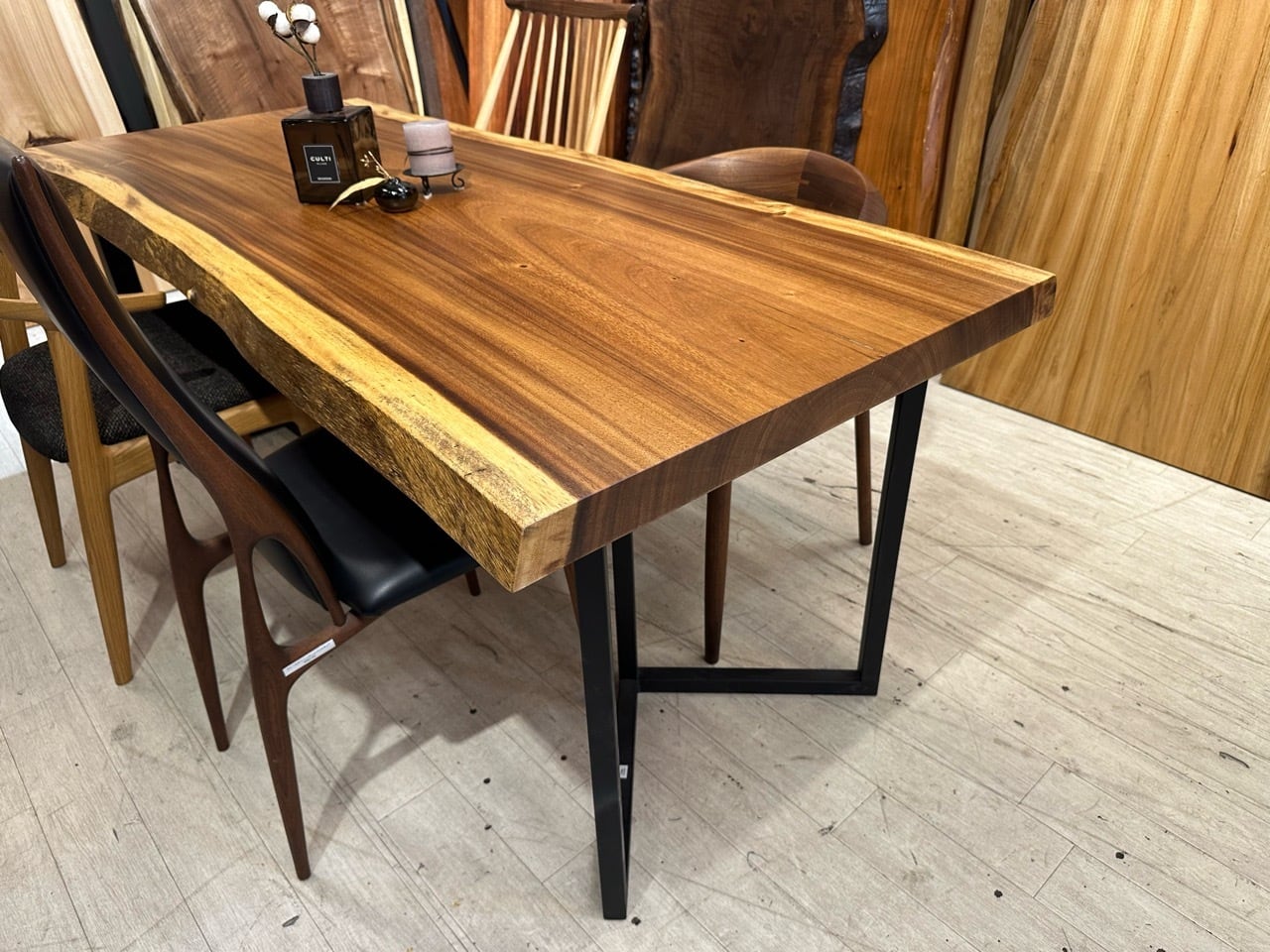 120kgまでを想定して耐荷重及び強度計算されたスチール部材を用いて一枚板及び無垢天板の専用に設計されております。