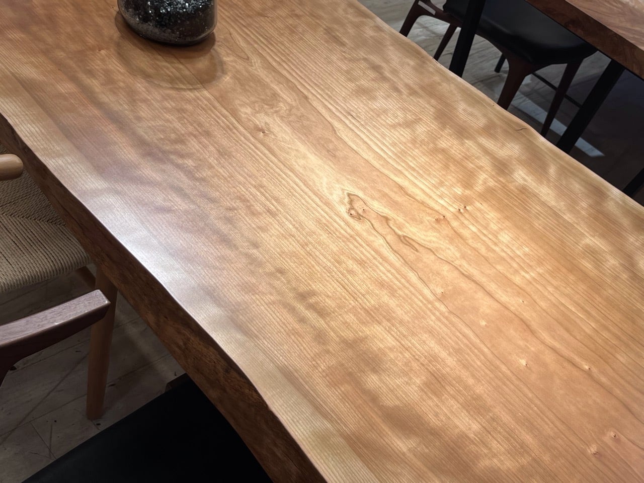 特に、こちらのアメリカンブラックチェリーはトチほど明るい白ではなく、ウォールナットほど暗くない中間色一枚板のため、どんなお部屋にも合わせやすい一枚板となっています。