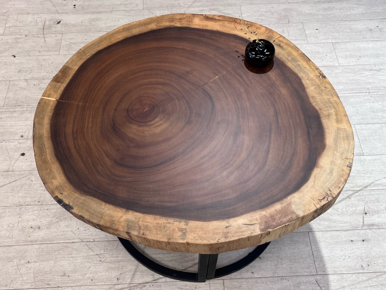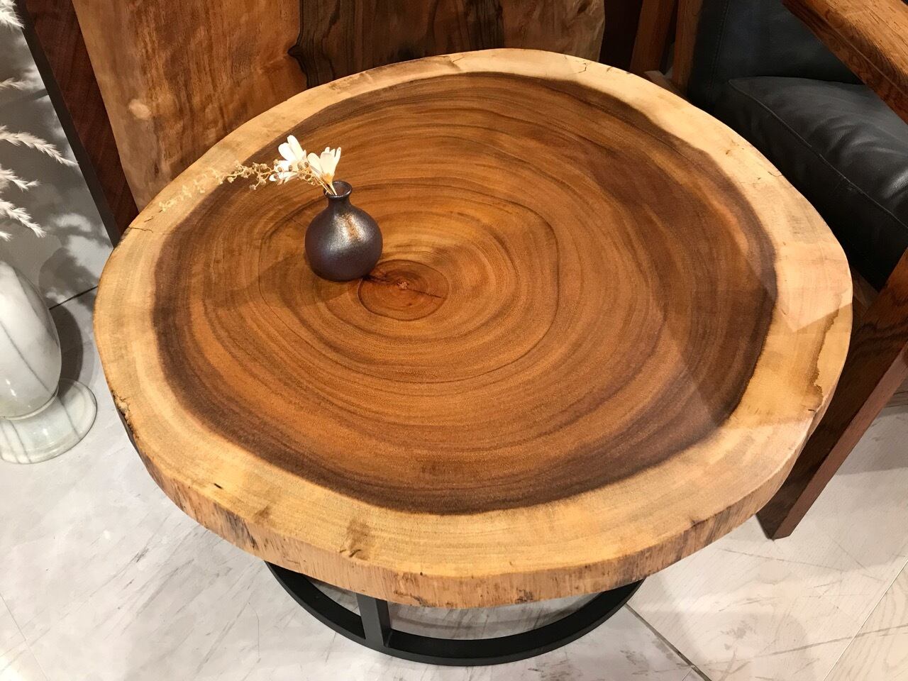 モンキーポッドは辺材がクリーム色、そして心材が金褐色をしていて、この色のコントラストが魅力的です。一枚板をダイニングテーブルにすると、この2色の絶妙なハーモニーを楽しむことができます。