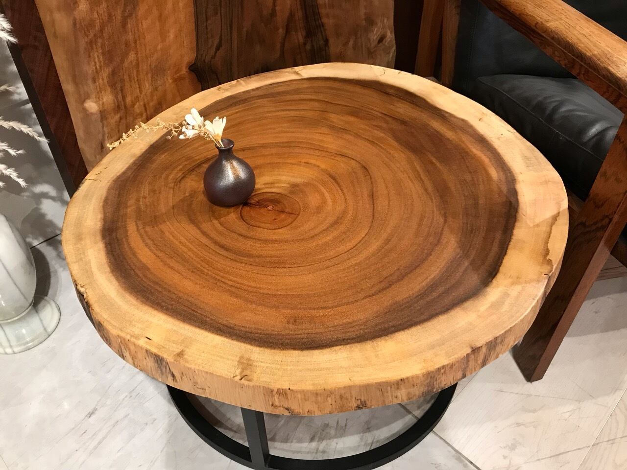 モンキーポッドは手頃なお値段も魅力の木材です。耐久性もひじょうに高く、特に水分や湿気に対する強さがあります。ウォールナットにも似た心材の色、そしてクリーミーなホワイトのカラーリングは、木を輪切りにして作る一枚板でも魅力を生みます。