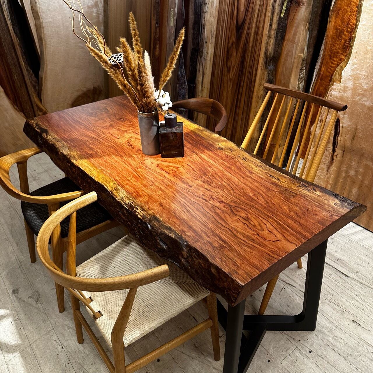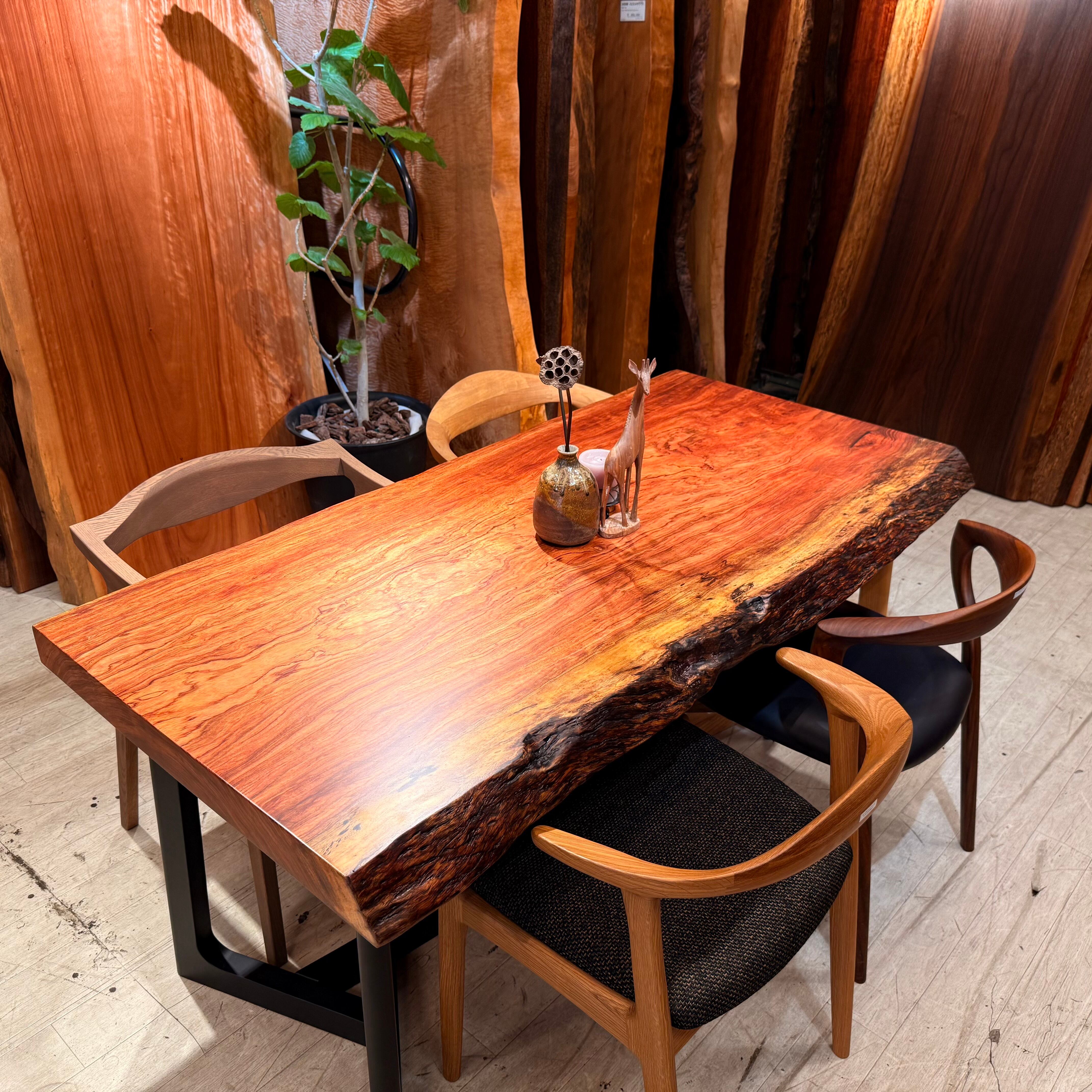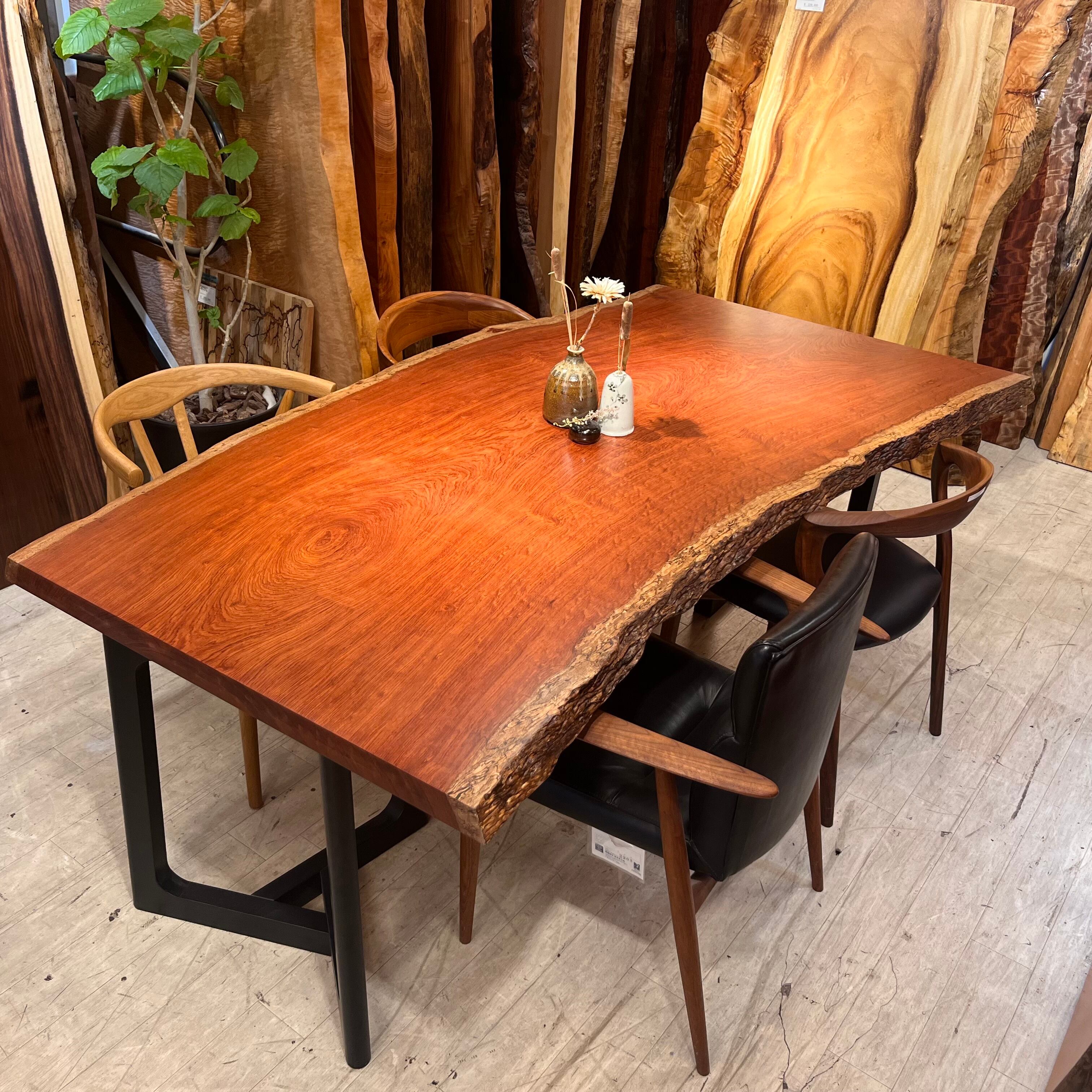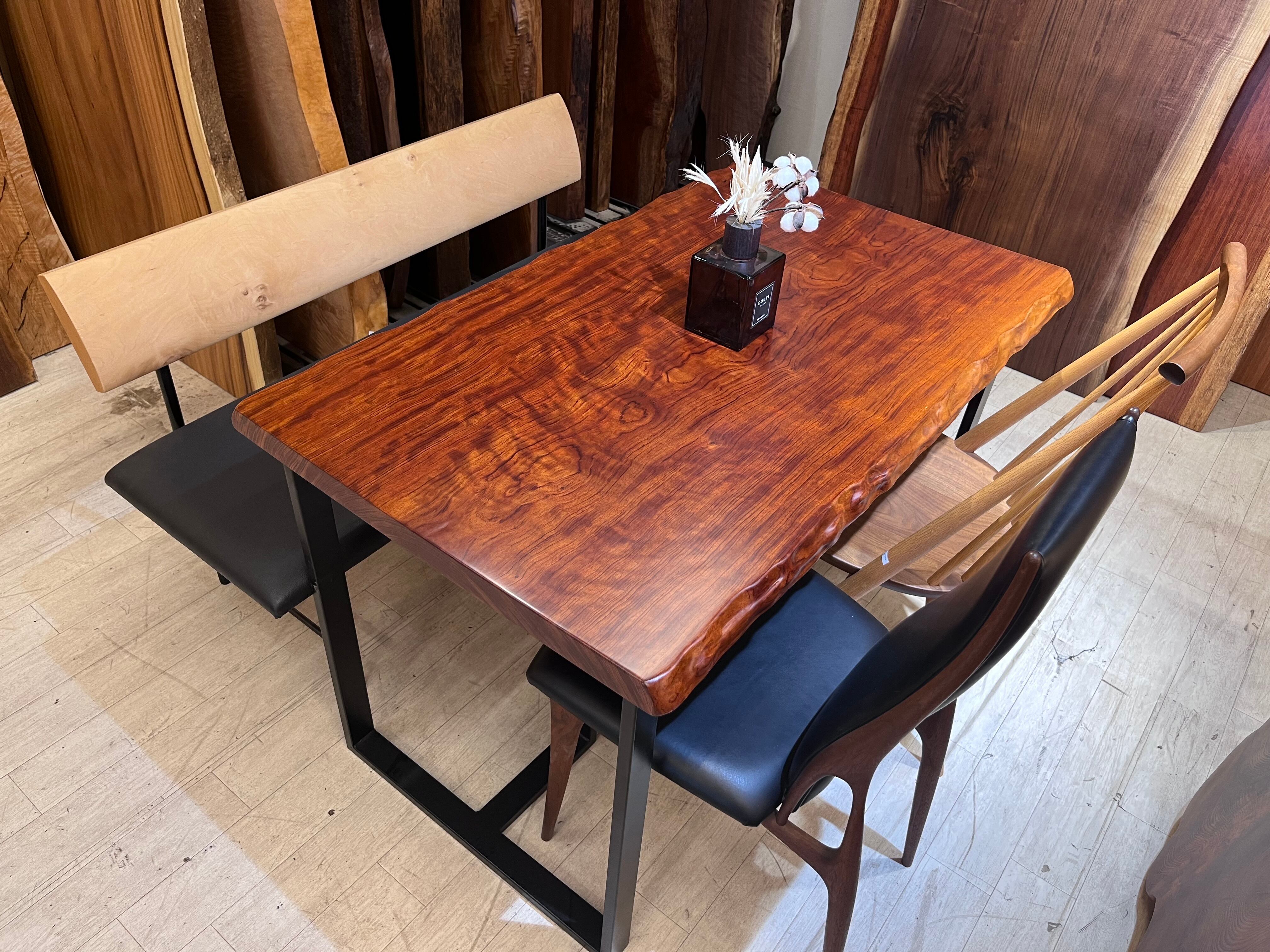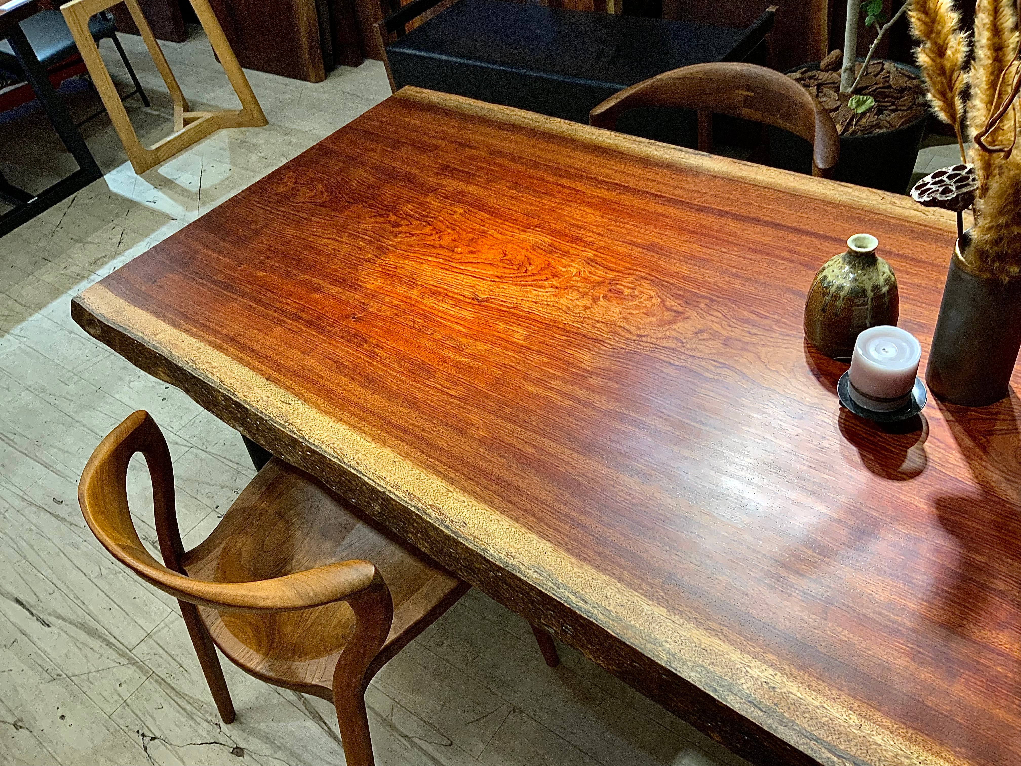 ブビンガの赤褐色は、非常に奥行きのある上品な光を放ちます。数百年という時間をかけて巨木となった樹木を、十年以上の時間を費やして天然乾燥。ブビンガそのものが持つ歴史に加え、製作に携わった人たちも、何か特別な感慨を覚えます。希少性が高まっていることもあり、今後、価格の高騰が心配されます。重厚な雰囲気と独特のツヤを持つブビンガは、やはり一枚板でこそ、その魅力が活かされます。